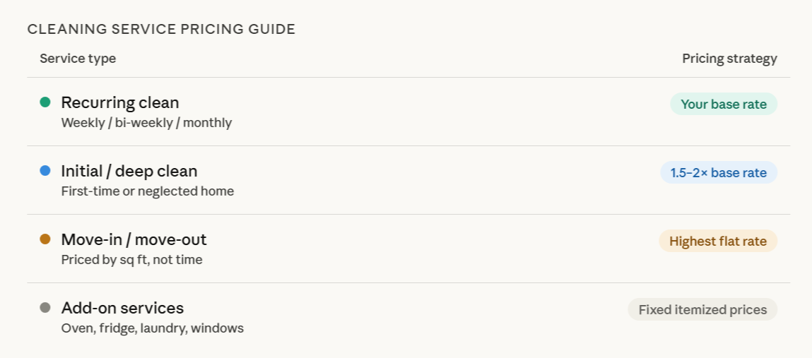 Add-on services: Inside oven, inside fridge, laundry, window cleaning. Itemize these separately with fixed add-on prices so clients can customize without forcing you to renegotiate the whole job. See our post on cleaning add-on ideas if you need help.