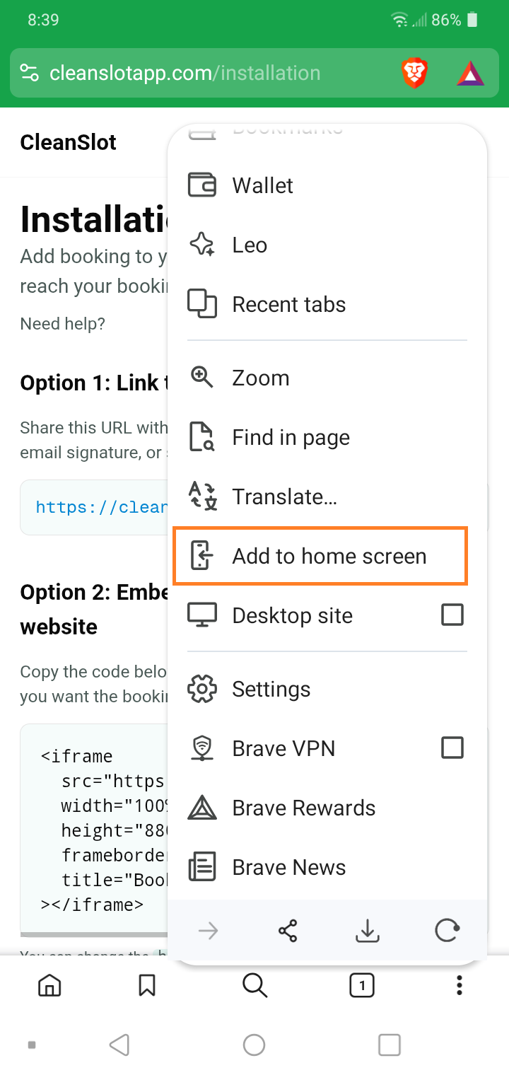 - Open CleanSlot in your phone browser.