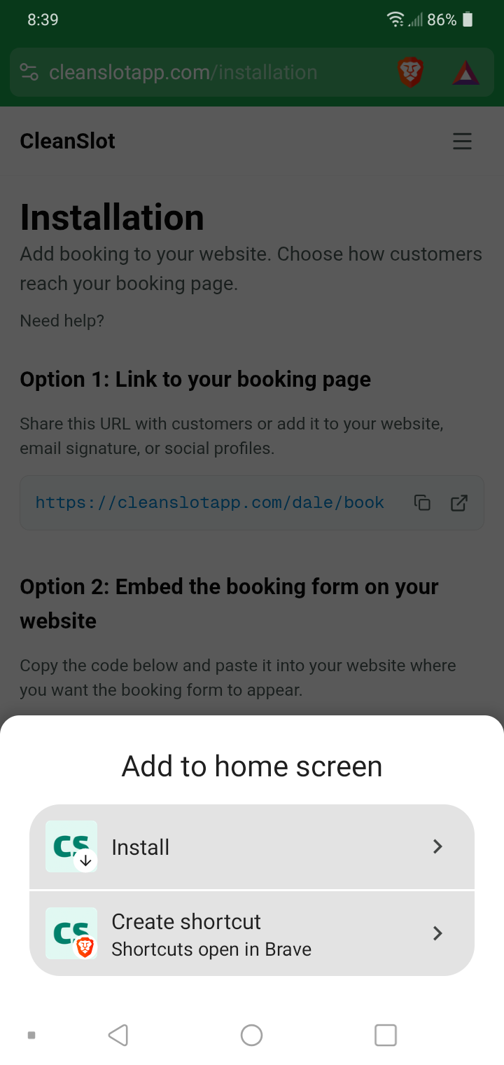 CleanSlot works as a PWA (progressive web app). That means you can install it from your mobile browser and open it from your home screen, like a normal app.